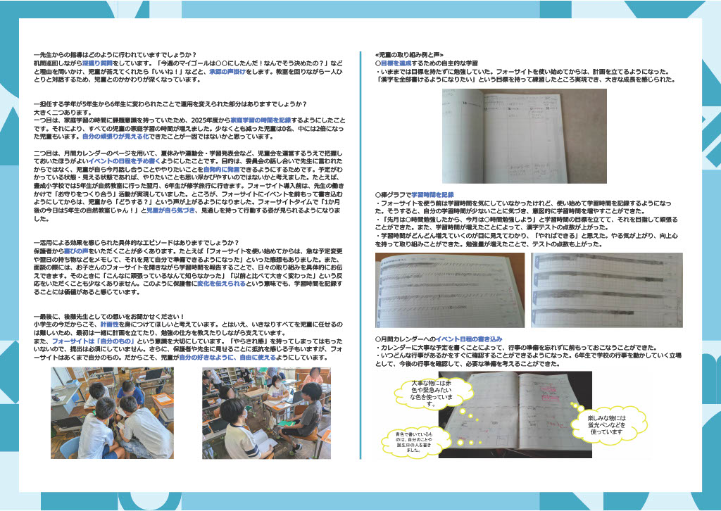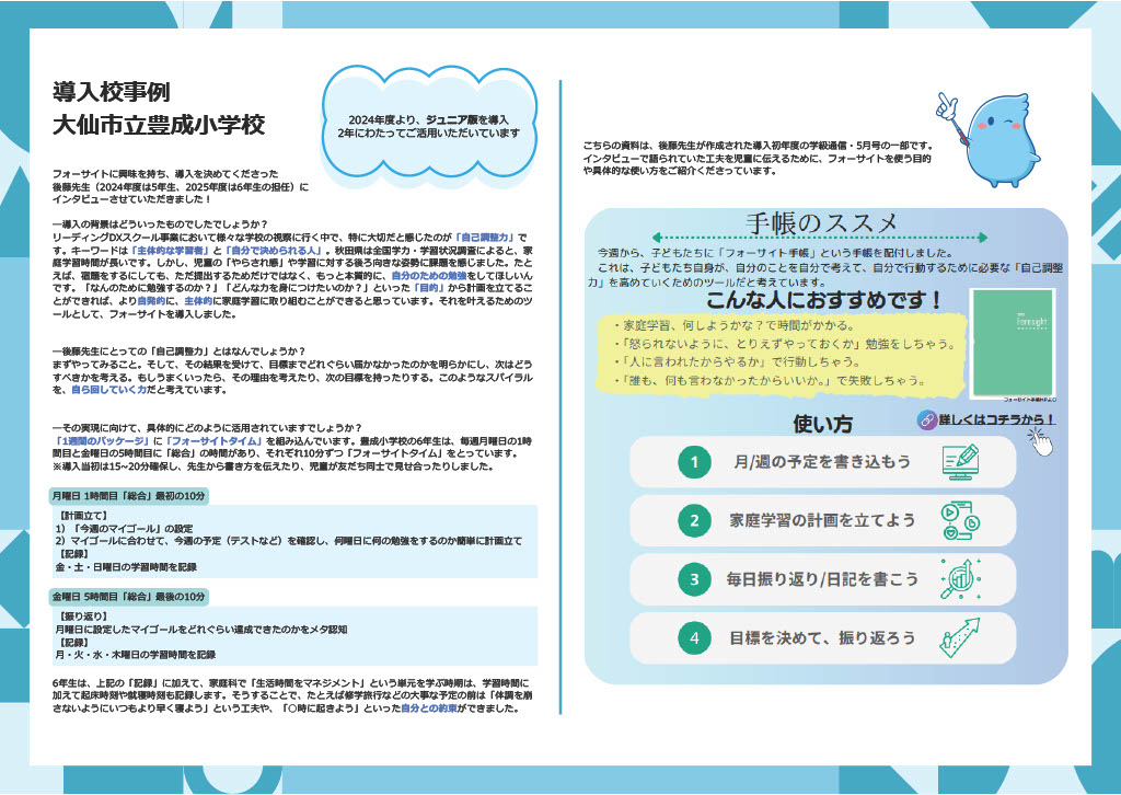 大仙市立豊成小学校 学校プロフィール 大仙市立豊成小学校 秋田県 手帳 やらされ感ではなく、主体的に学習できる人になってほしいという想いで フォーサイトをご活用いただいている、大仙市立豊成小学校の後藤先生にインタビューしました。 この記事がおすすめな方: ・小学校の先生 ・ジュニア版をご使用中の先生 ・自発的、主体的に学習に取り組んでほしいと思っている先生 ・フォーサイトの運用方法に迷っている先生 この記事から得られるヒント: ・「フォーサイトタイム」を組み込むタイミング ・児童・生徒への、フォーサイトを使う意義の伝え方 ・フォーサイトの活用による行動変容 ・実際に小学生が書いた手帳の事例